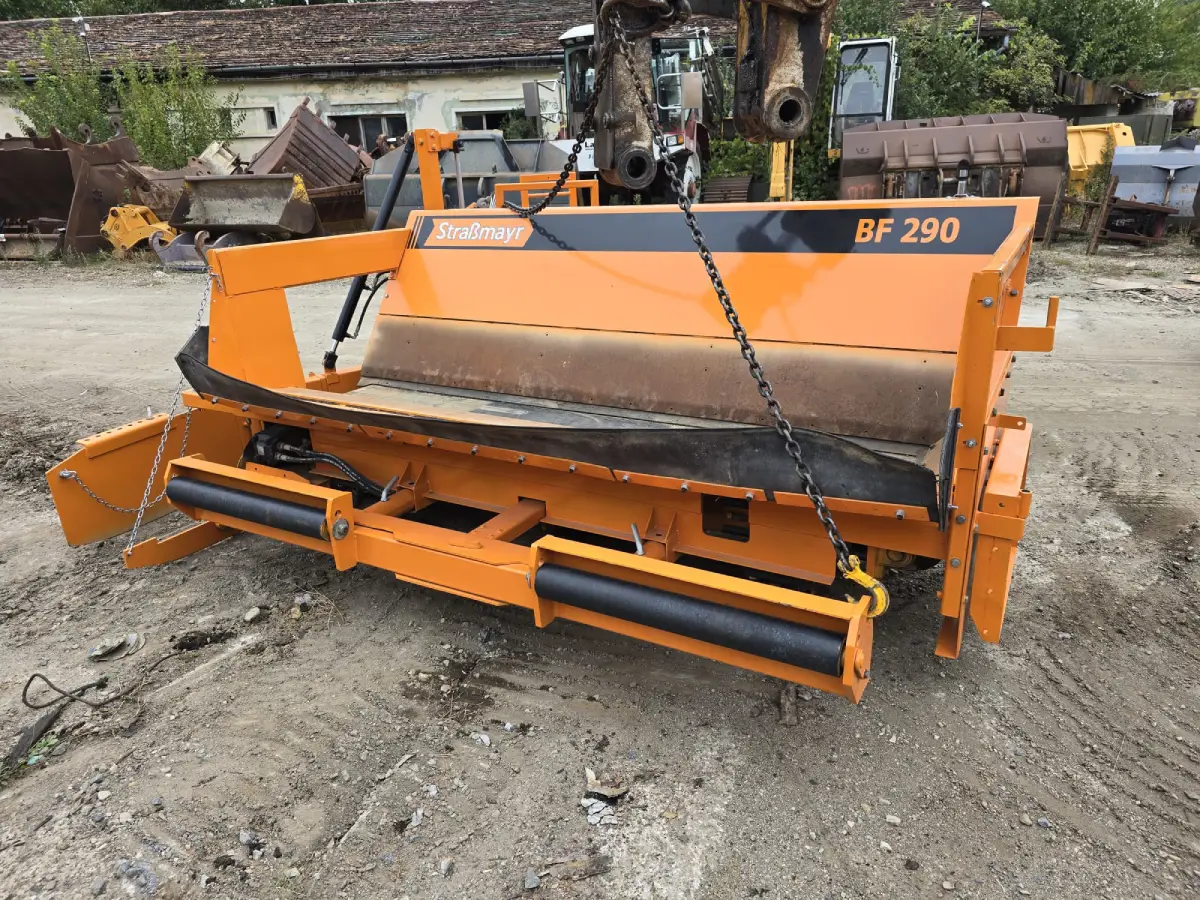 Strassmayr BF290 padka finisher, 695 üzemóra, 2500 kg önsúly, hidraulikusan állitható, Lombardini diesel motorral, homlokrakodó és kotró-rakodó-ra szerelhető, azonnal munkára fogható állapotban, friss import.