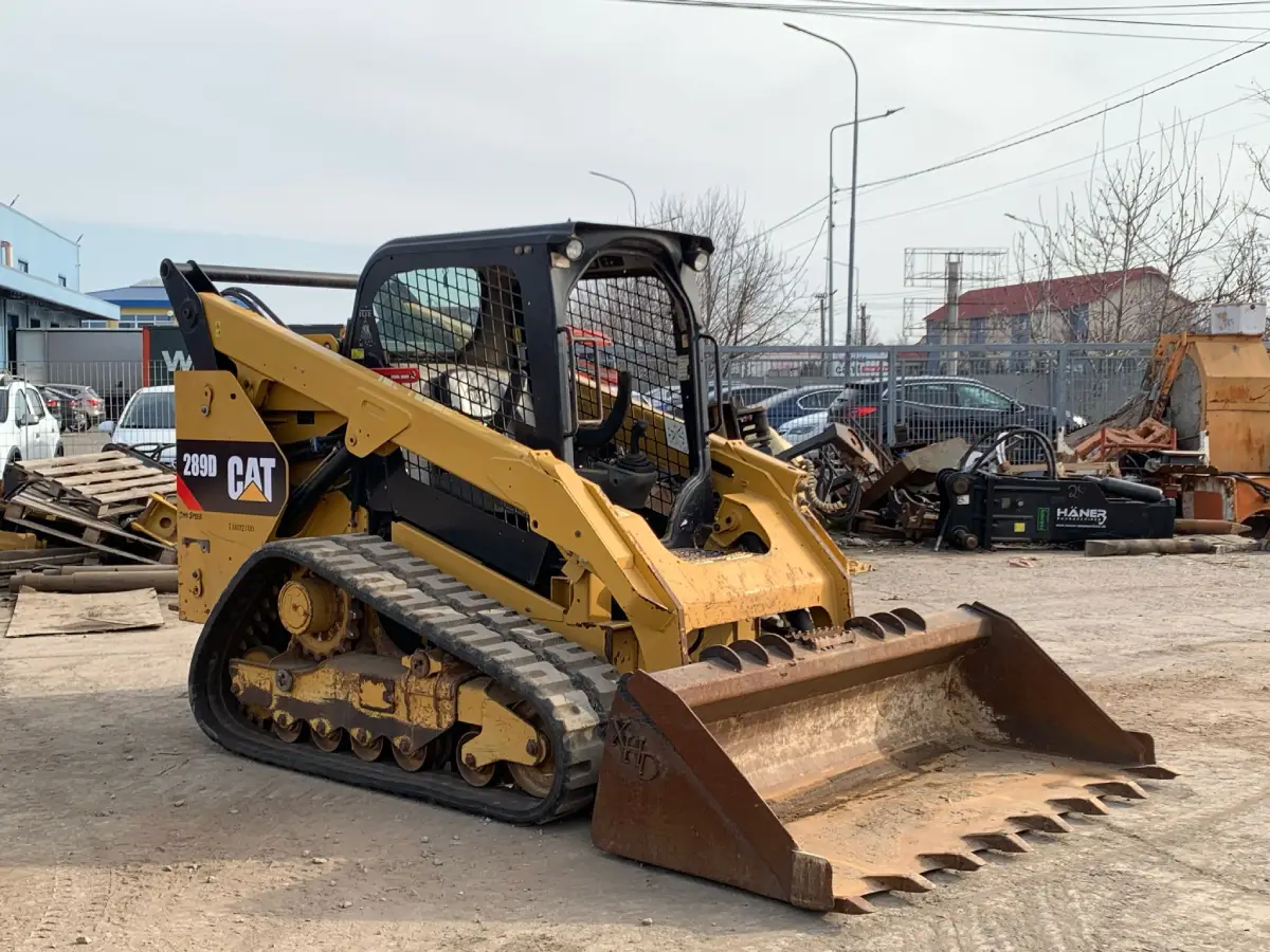 Miniincarcator pe senile de cauciuc Caterpillar 289D, an 2014, 6300 ore de lucru, greutate proprie 4700 kg, motor in 4 pistoane de 55 kW CAT, HI FLOW, comenzi pe joystick, cale de rulare buna, cupa de pamant, stare foarte buna de lucru, recent adusa.